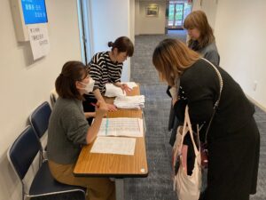 ◆受付では法人名や園名、お名前を確認。4つの分科会に振り分け、会場の部屋を用意しました。