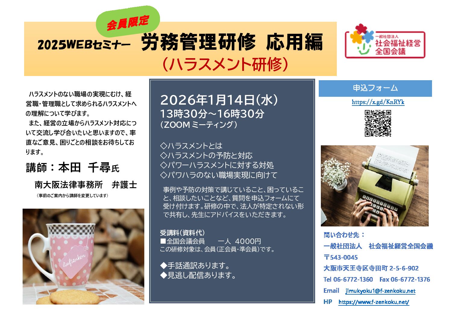 1/14労務管理研修(応用編・ハラスメント研修)のご案内